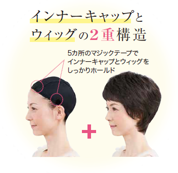 インナーキャップの着脱とウィッグ本体のサイズ調整で脱毛~発毛までの頭周りのサイズ変化にしっかり細やかに対応できます。